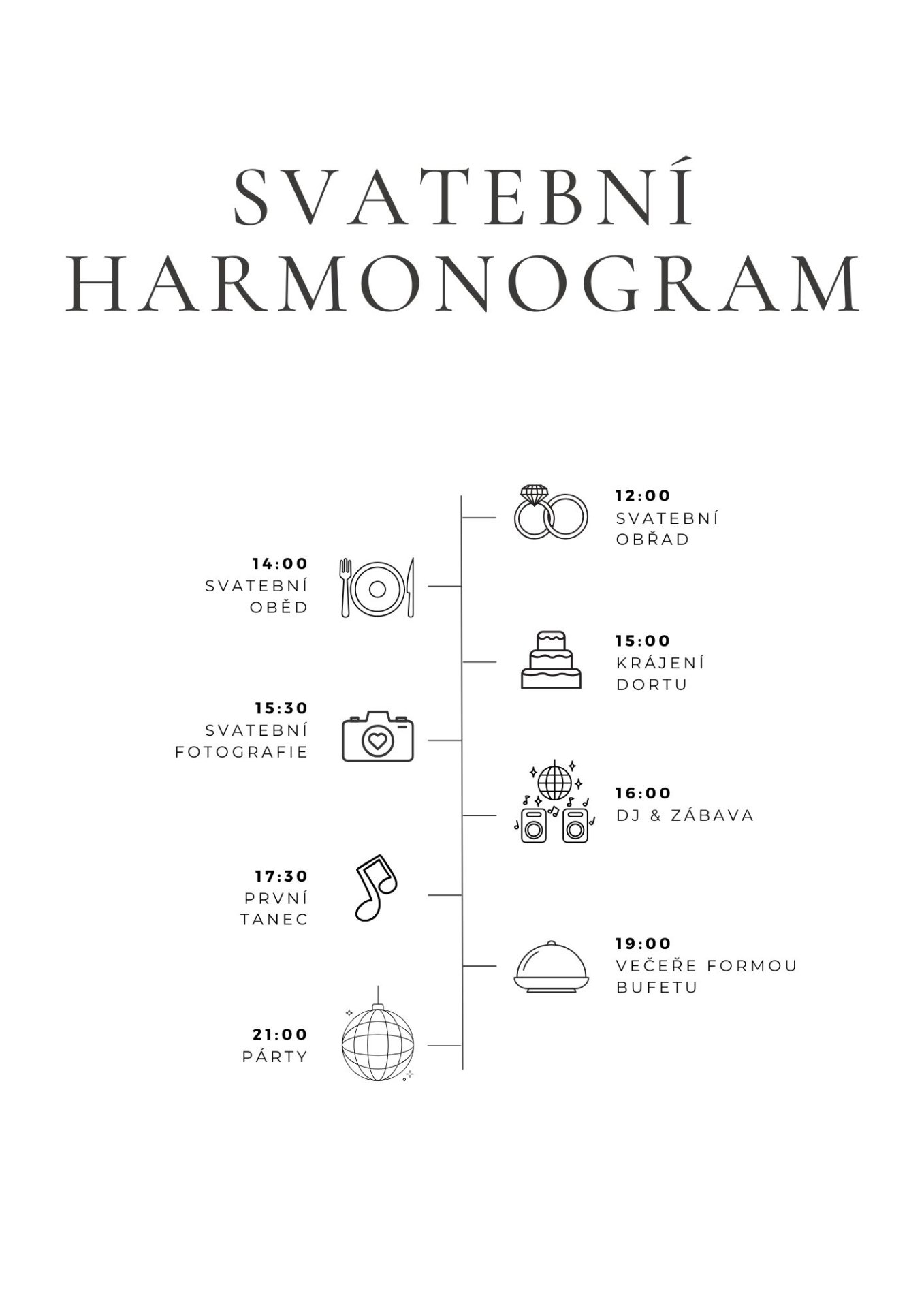 Svatbení obřad začne ve 12:00. Prosíme, abyste dorazili o 15–20 minut dříve, abyste nic nezmeškali a pomohli nám začít včas.